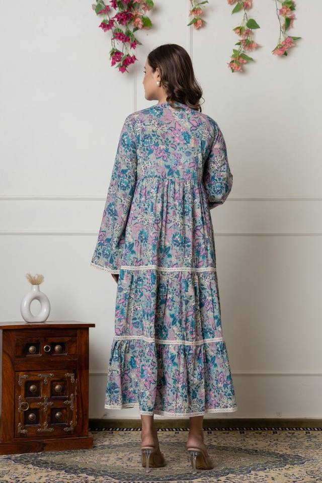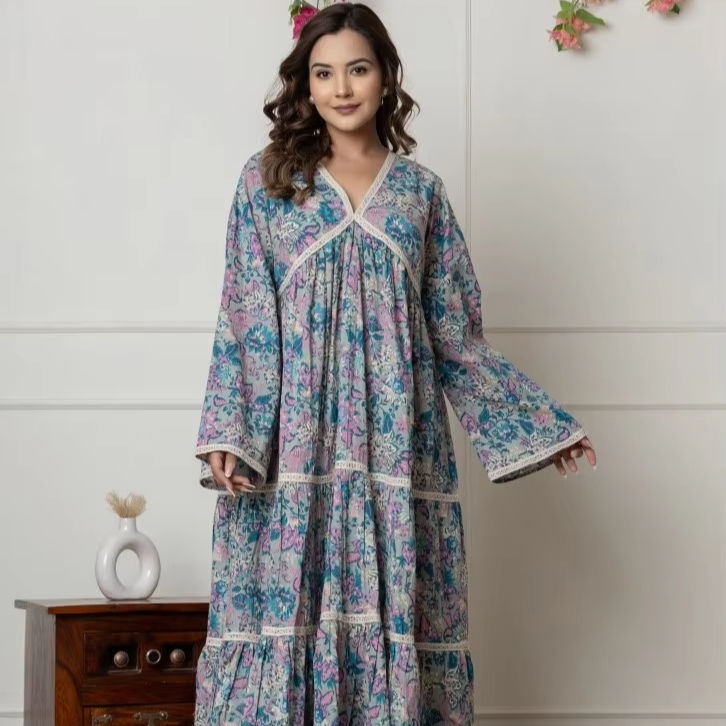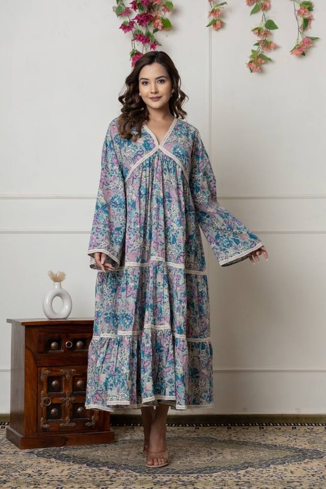Pastel Blue & Pink Floral Long Cotton Dress with Lace Detailing Mexi Dresses 100% Cotton Slip - on Style Floral Print