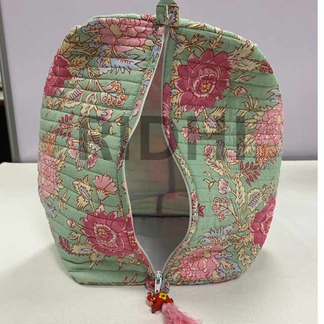 Pastel Jade with Pink Blossom Cotton Quilted Zipper Tote Bag Floral Block Printed Travel Toiletry Reusable Grocery Shopping Tote