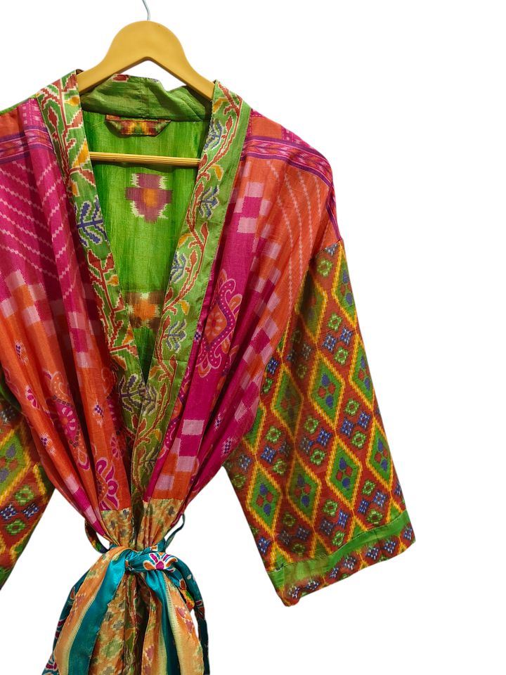 Patchwork Kimono Robe Bikini Cover Up Night Wear Long Robe, Handmade Indian Vintage Recycled Silk Sari Kimono,