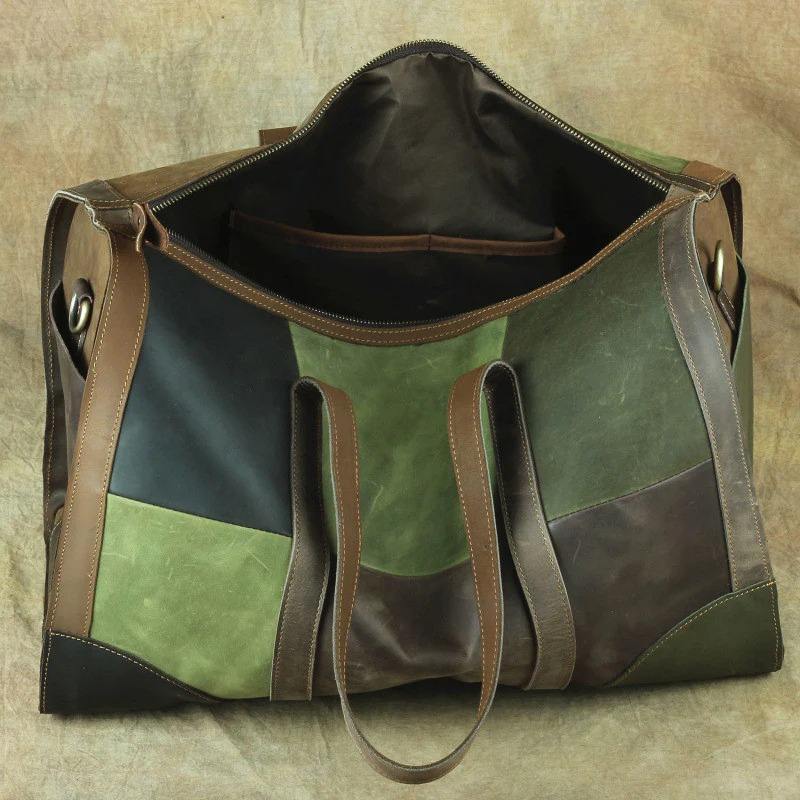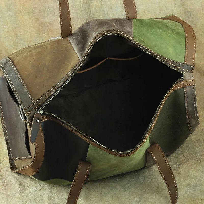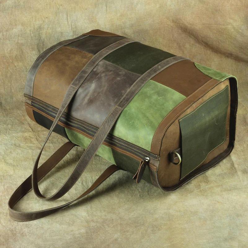 Patchwork Leather Duffle Bag Men Vintage Travel Weekender Gym Sports Green Brown Colorblock Large Overnight Luggage Tote
