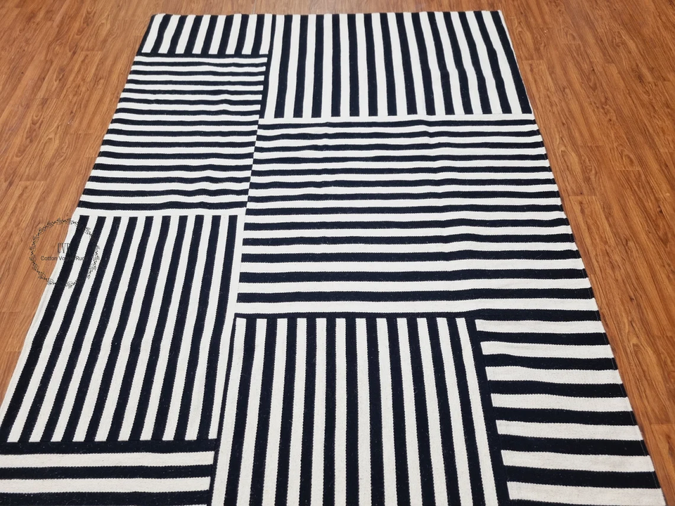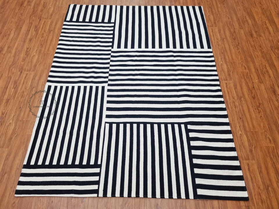 Patchwork Wool Rug | Handwoven Wool Kilim Rug | White Black Striped Living Room Bedroom Dining Room Kids Room Rugs