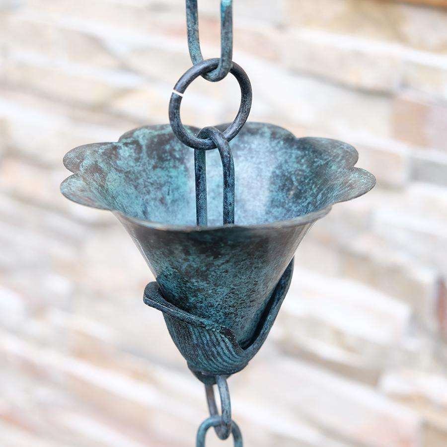 Patina Kanji Cups Rain Chain Large Metal Flowers Hand Cast Base Patina Finished Sculptural Design Functional Outdoor Rain Chain