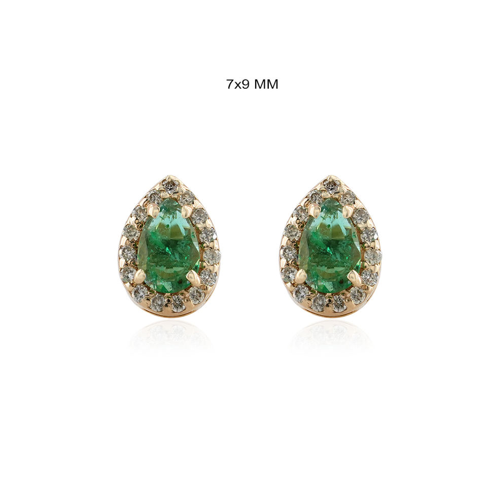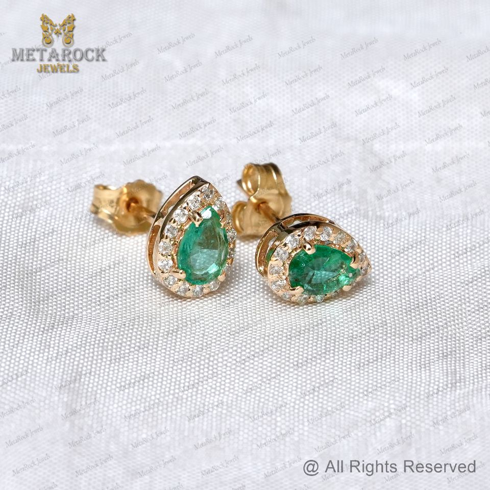 14k Gold Pave Diamond Natural Emerald Gemstone Pear Shaped Minimalist Stud Fine Earrings Jewelry Wholesale
