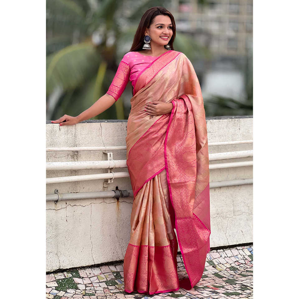 Peach Kanjivaram Soft Tissue Silk Leheriya Saree Traditional Zari Woven for Indian & Pakistani Clothing