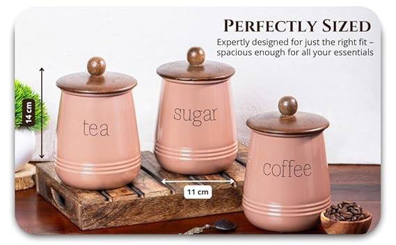 Peach Metal Tea Sugar Coffee Canister Set with Wooden Lids for Elegant Kitchen Storage and Charming Modern Countertop Decor