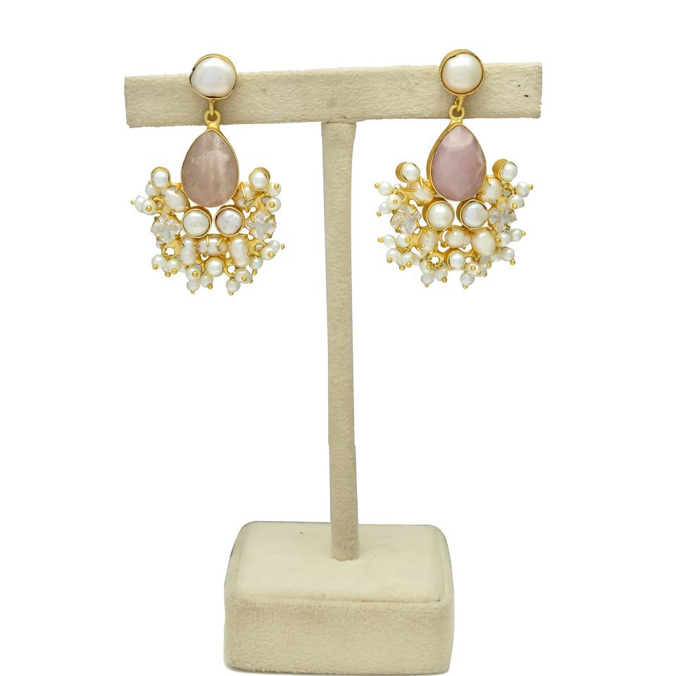 Peach Vintage Pearl Hanging Long Stud Earrings Women Beautiful Wedding Bridal Accessory 24K Gold Plated Everyday Brass