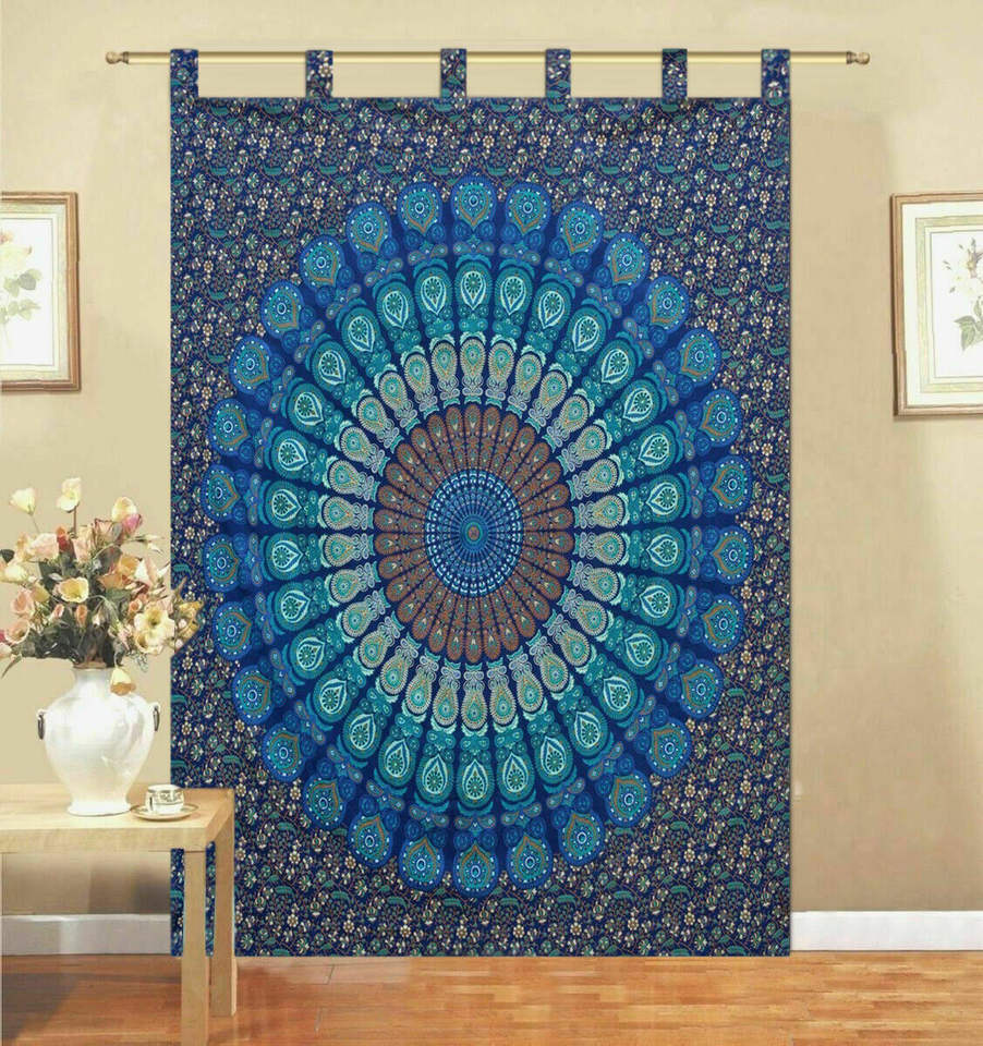 Peacock Mandala Floral Pleated Blue Cotton Single Panel Window Door Curtain Drape Valance Beautiful By Indian Consigners