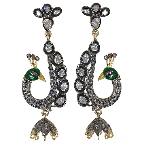 Peacock Themed Drop Earrings with Green Enamel & Diamonds Gold Plated Art Palace Jewelry for Wedding Party or Gift