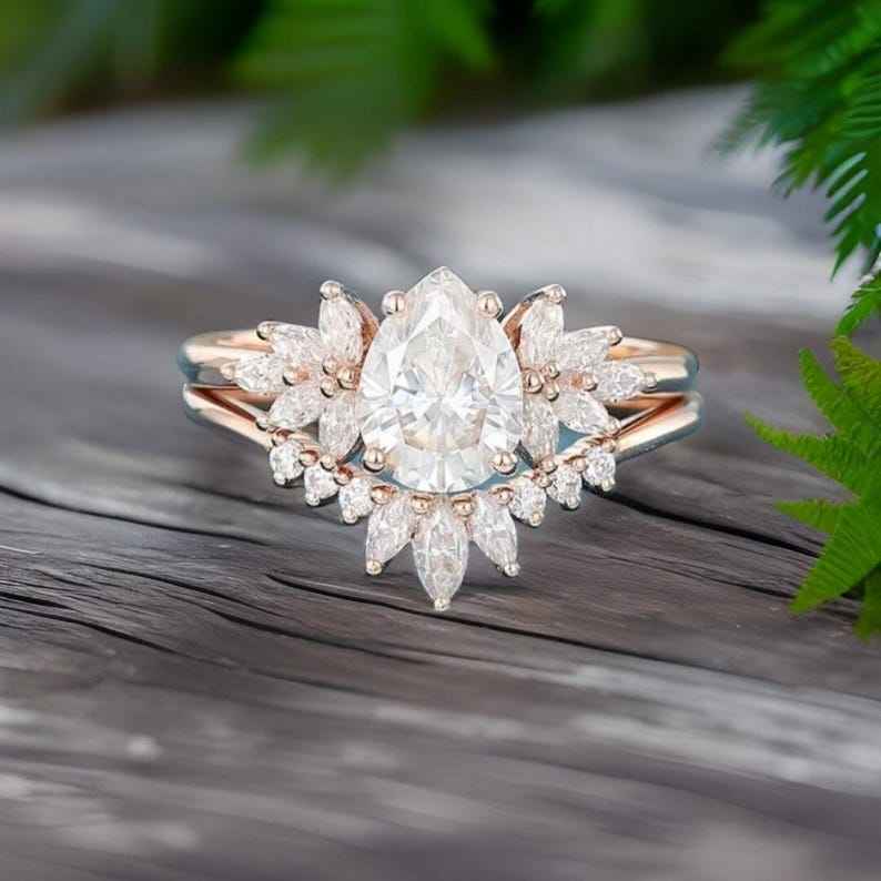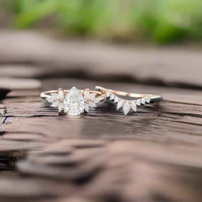 Pear Shaped Moissanite Engagement Ring Set Vintage 925 14K Rose Gold Plated Marquise Cluster Curve Ring