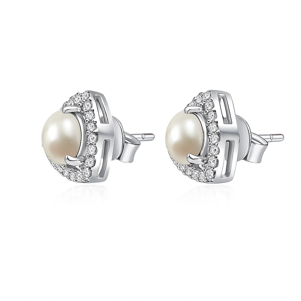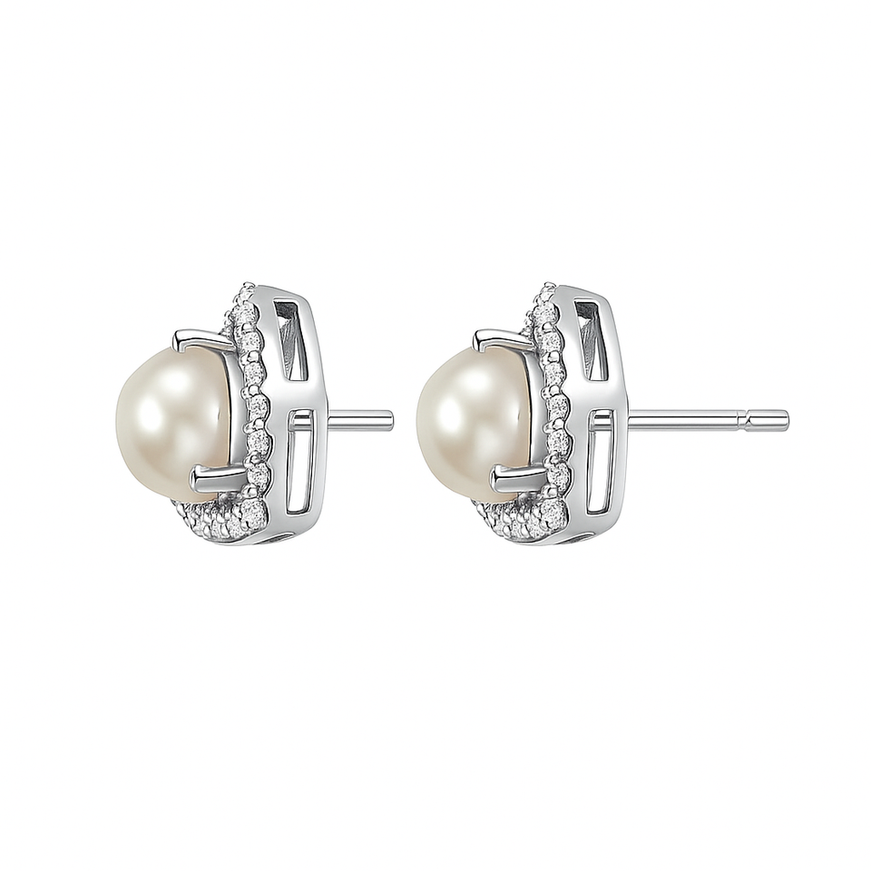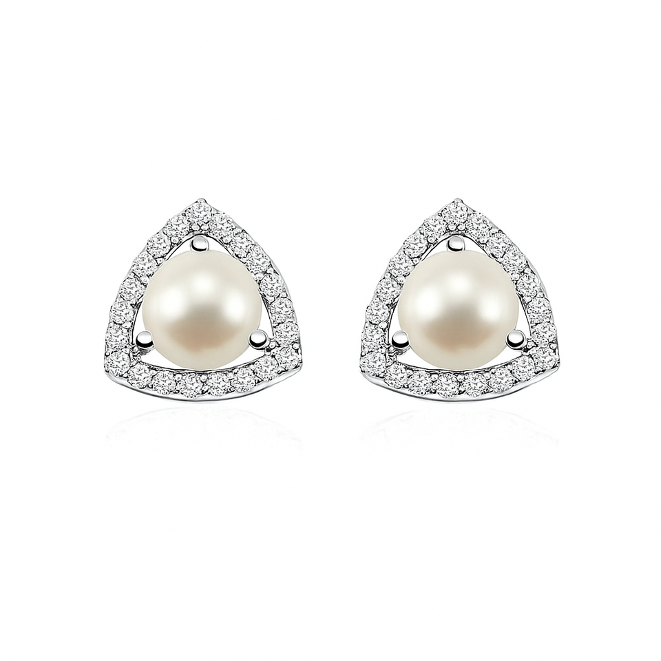 Pearl Triangle Halo Stud Earrings in Sterling Silver Rhodium Plated Romantic Style for Anniversary