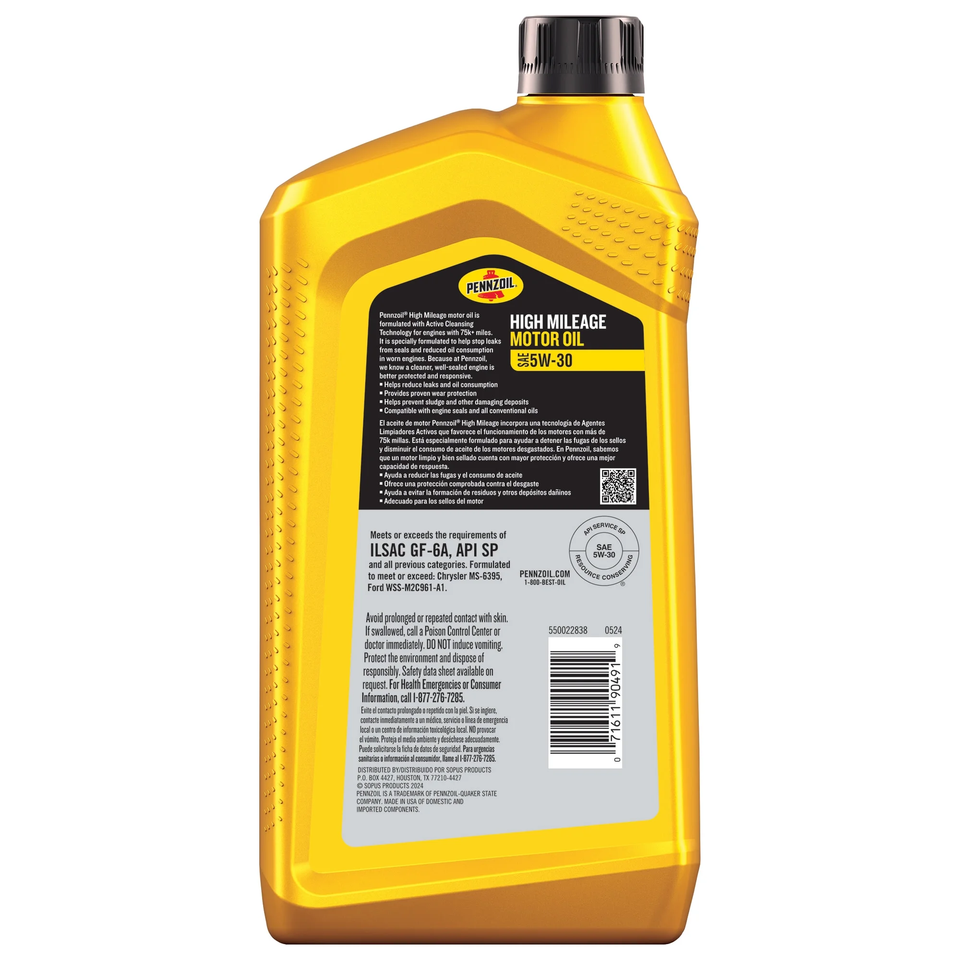 Pennzoil High Mileage 5W-30 1 QT Automotive Lubricant Engine Oil Anti-Wear Formula API SP ILSAC GF-6 Certified Reduces Leaks Oil