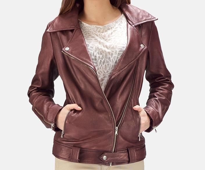 Peplum style women leather jacket with cinched waist and feminine silhouette for elegant evening or formal wear