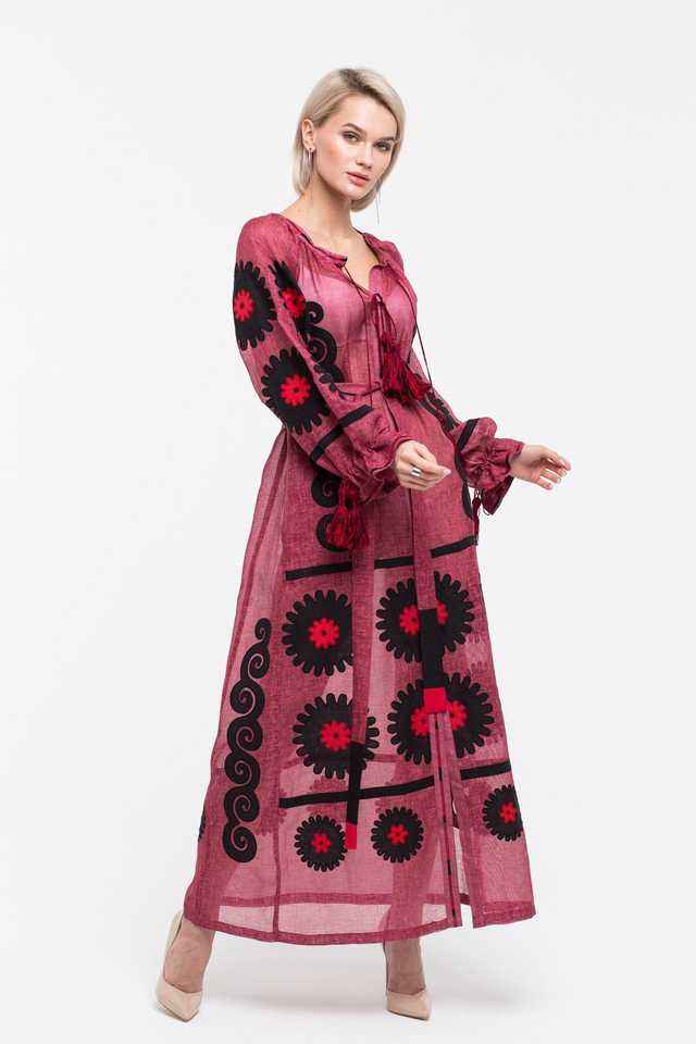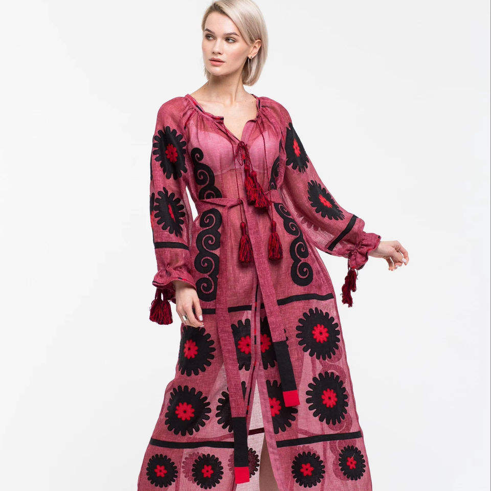 Perfect Bohemian Linen Ukrainian Dress Eco-Friendly Cross-Stitch Embroidery Puff Sleeves Loose Summer Neckline Tassel Waist Belt