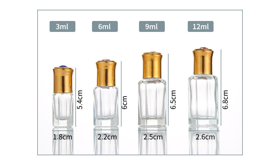 Perfume Bottle 3ml 6ml 9ml 12 ml Clear Octagon Round Attar Glass Roll on Bottles With Glass Roller