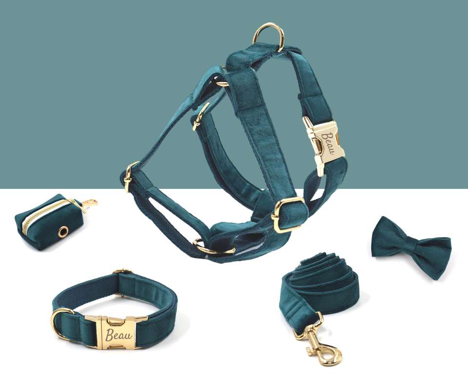 Personalized And Leash Set, Green Custom Veet Dog Collar Bowtie Poo Bag Holder, No Pull Harness For Boy Puppy