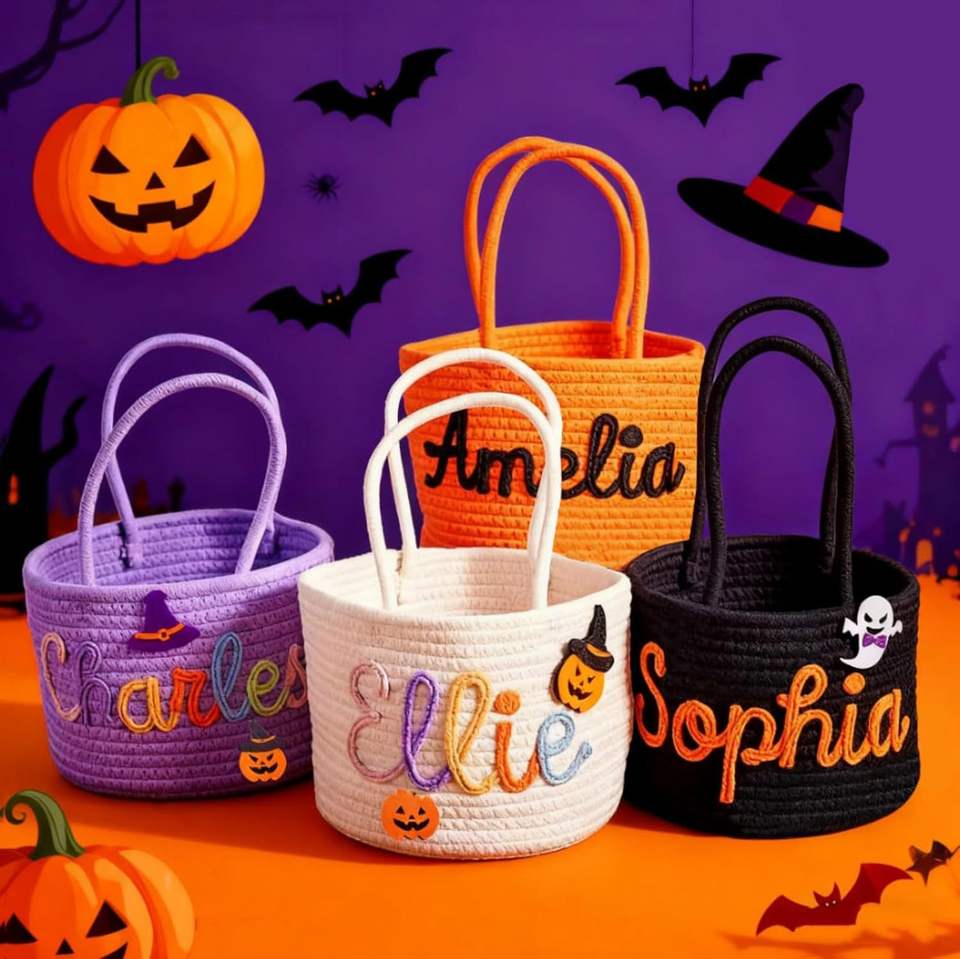 Personalized Baby Cute Cotton String Embroidered Candy Bucket Halloween Decor Trick or Treat Bag Decorations Halloween Basket