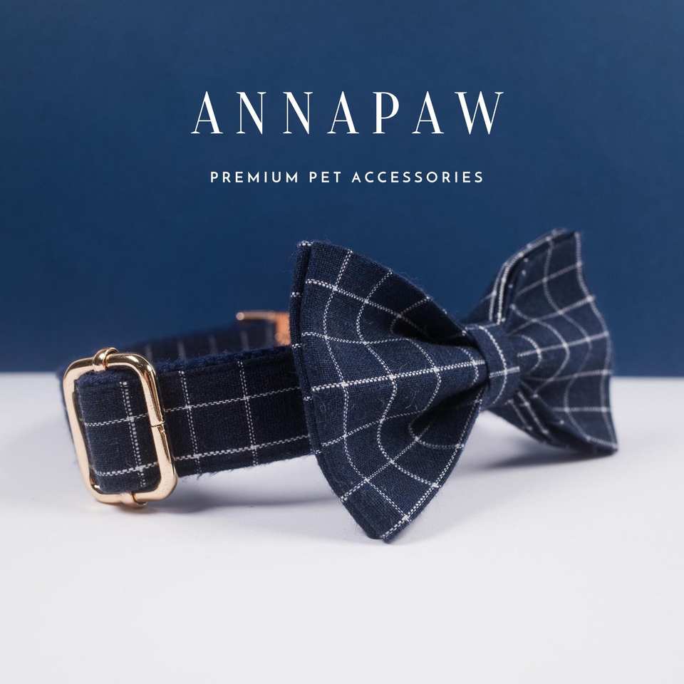 Personalized Blue Plaid Leash Bow Set, Name Tag, Boy Dog With Bow, Large Small Custom Puppy Collar Set