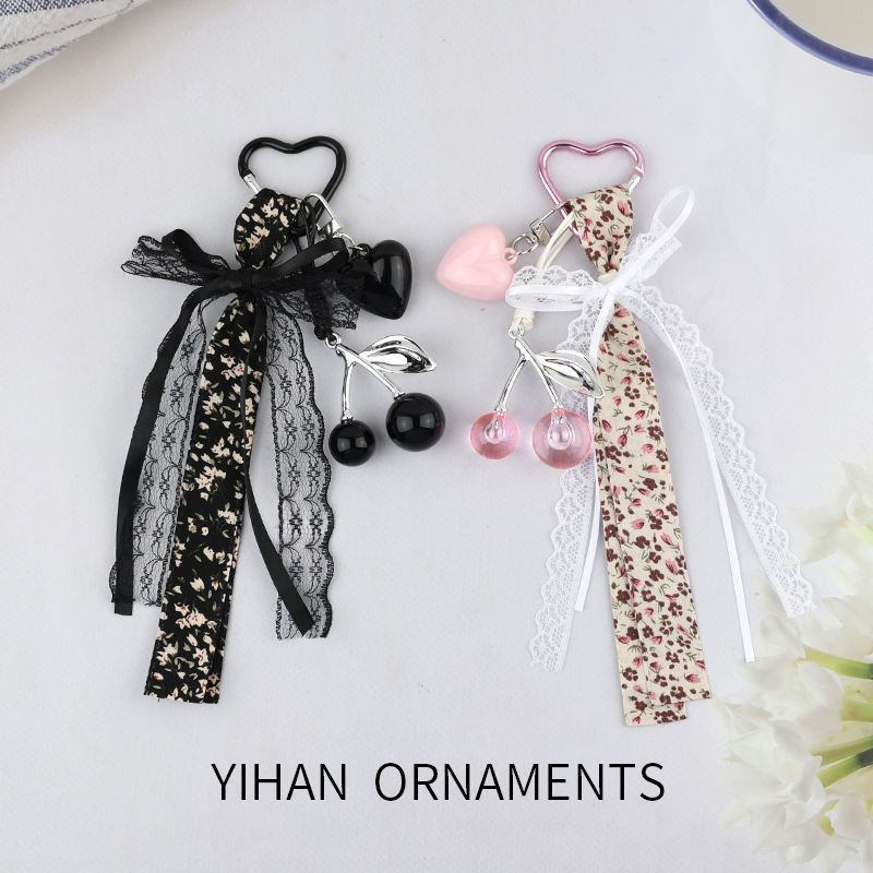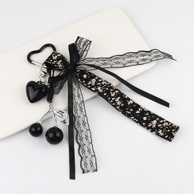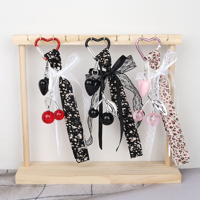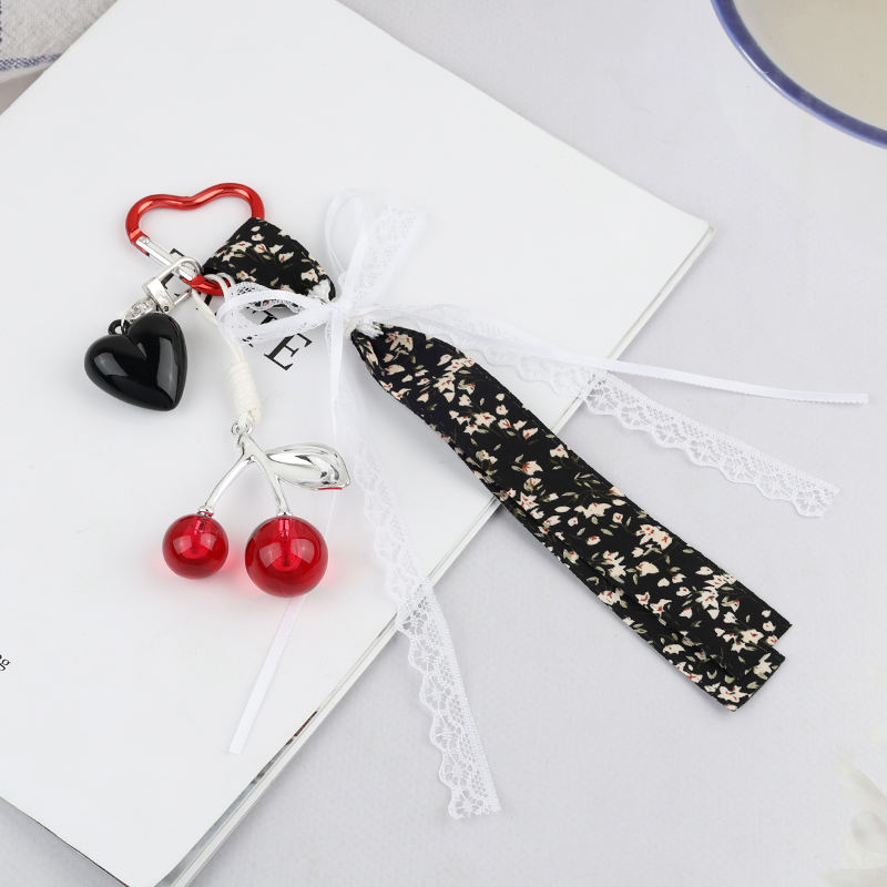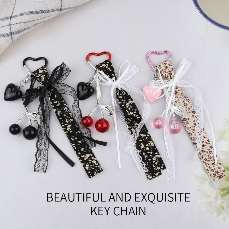 Personalized Cherry Heart Keychain Floral Lace Ribbon Pendant Heart-Shaped Hook Metal Coach Keychain Charm Accessory for Bags