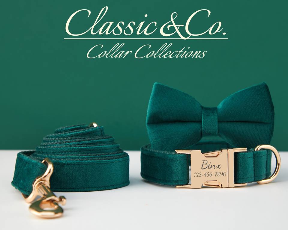 Personalized Dog Bow Tie Leash,Emerald Veet Collar With Engraved Name Metal Buckle,Wedding Puppy Gift,FREE Shipping