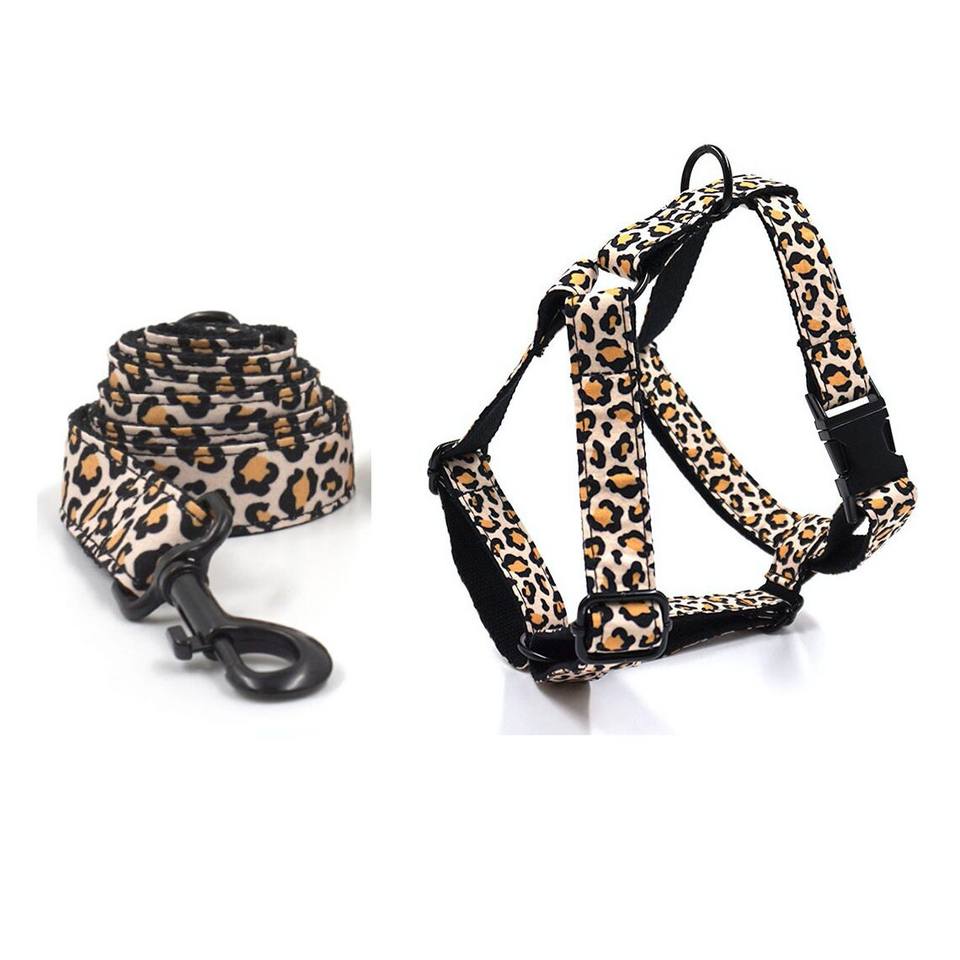 Personalized Engraved Handmade Brown Dog Harness Set with Leopard/Collar & Lead Design Includes Bowtie