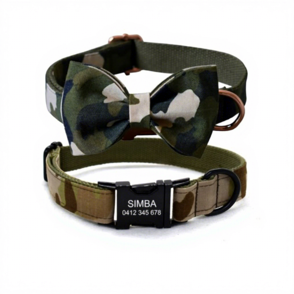Personalized Engraved Leather Dog Collar and Lead Set with Rivet Decoration Custom Name or Design Removable Bow Tie Available
