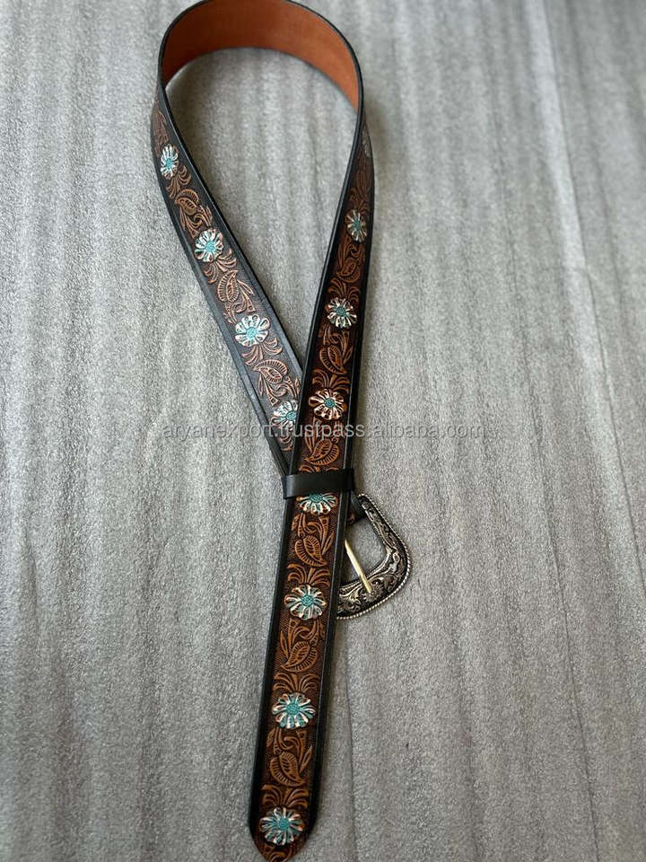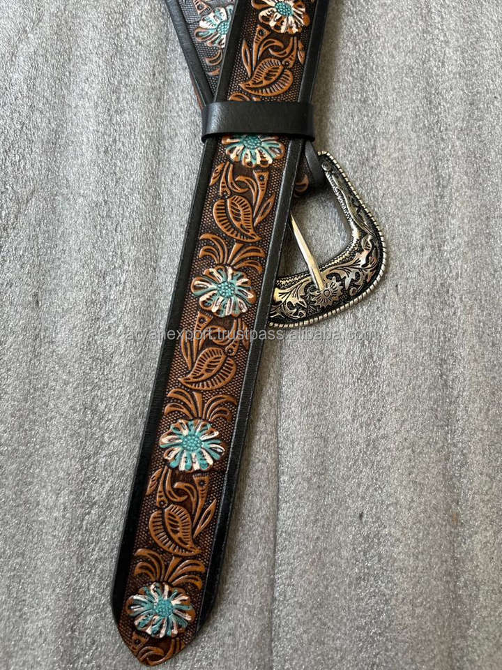 Personalized Genuine Leather Western Hand Tooled Hand Painted Flower Design Floral Belt With Removable Buckle Cowboy Waist Belts