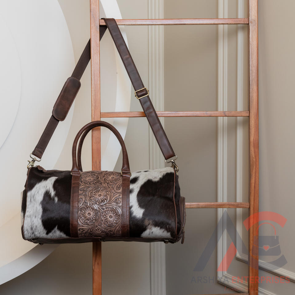 Personalized Hair on Tooled Leather Large Duffel Bag Cowhide Overnight Luggage Bag Genuine Leather Travel Weekender Unisex Bag