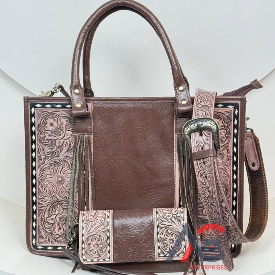 Personalized Hand Tooled Cowhide Concealed Carry Tote Bag & Handcrafted Organizer Wristlet Wallet 2-Piece Combo Set for Women