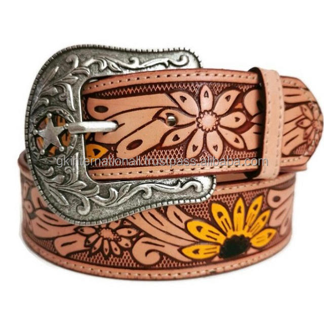 Personalized Hand Tooled Floral Pattern Tan Finish Western Leather Tooling Belt for Men with Removable Floral Brass Buckle