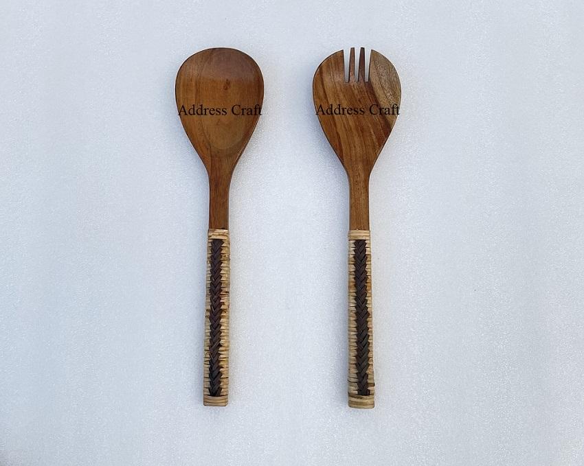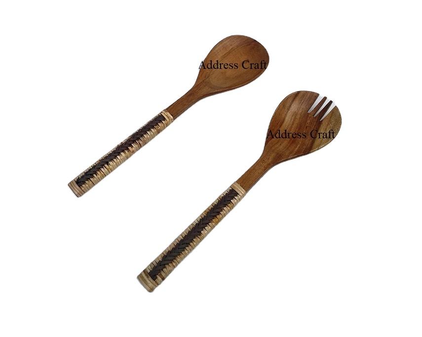 Personalized Hand Woven Eco-Friendly American Style Wood Rattan Salad Server Set with Cutlery Handles 11 Inch