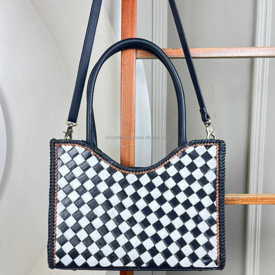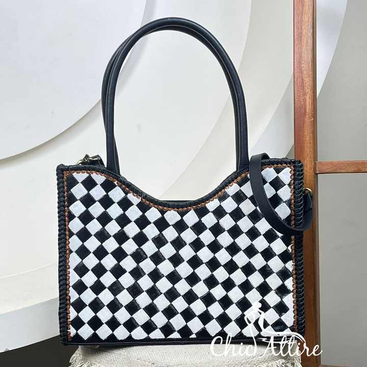 Personalized Handmade Single Shoulder Hand Tooled Leather Tote Bag Black & White Checkered Pattern Zipper Handbags for Women's