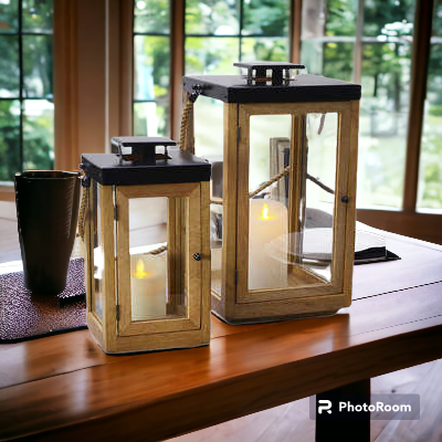 Personalized Iron Lantern Welded Rustic Wood Finishing Candle Holder and Candle Pillar Holder for Home Decor