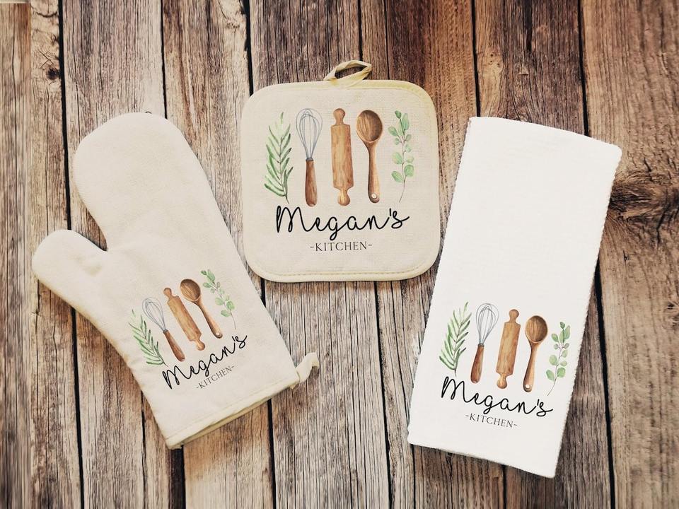 Personalized Polyester Cotton Kitchen Towel Oven Mitt Pot Holder Set High Water Absorbency Reusable New Home Gift for Couples