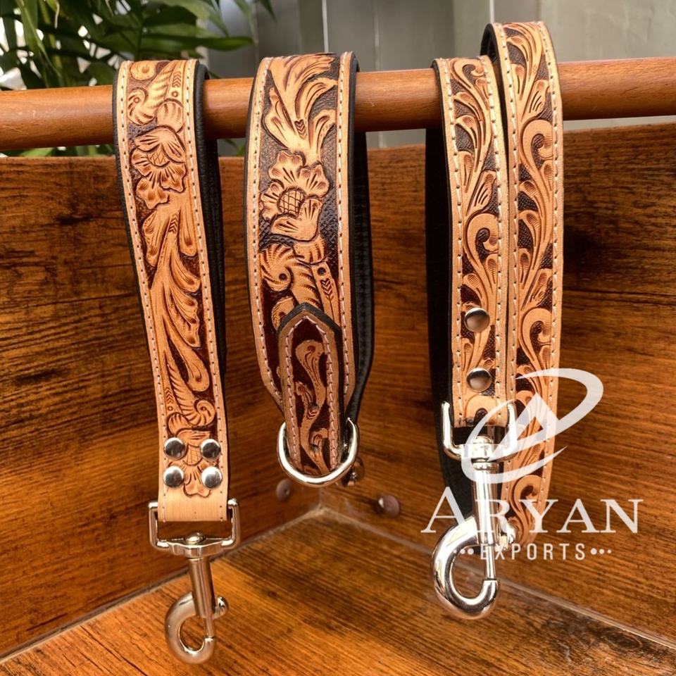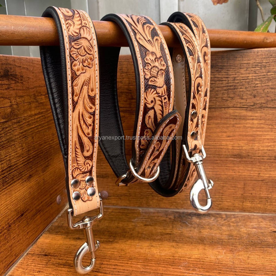 Personalized Pet Accessories Hand Tooled Leather Dog Collars Luxury Genuine Leather Pet Leash Cowhide Dog Training Traffic Lead