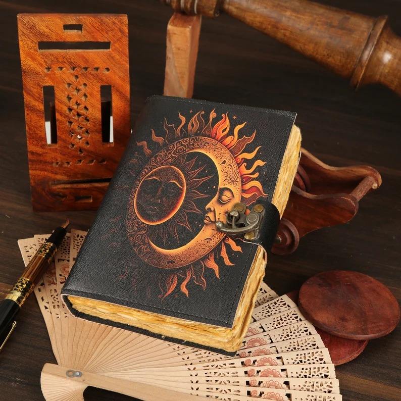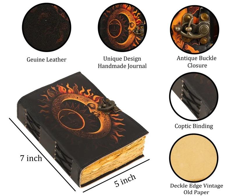 Personalized Sun & Moon Print leather journal, Moon journal, Blank spell book, Grimoire journal, Birthday gift, Halloween Gift