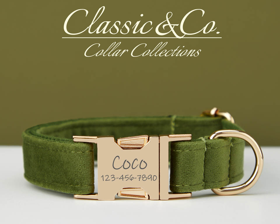 Personalized With Engraved Pet Name Metal Buckle,Militarygreen Veet Dog Collar And Leash Set With Bell And Bow,Free Shipping