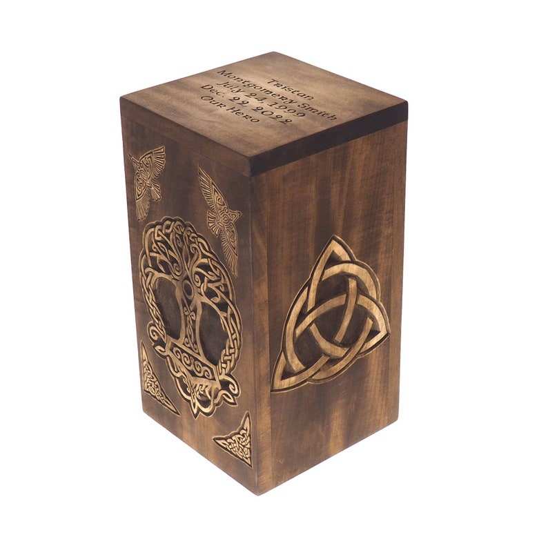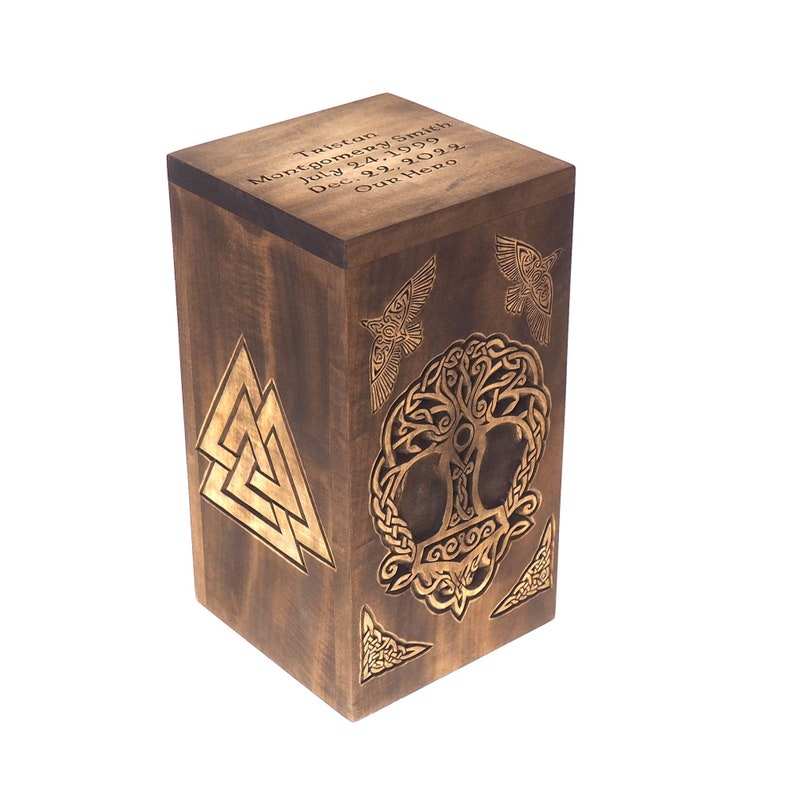 Personalized Wood Urn for Human Ashes Thor Hammer Ravens Memorial Box Carved Keepsake Cremation Urns Boxes for Burial