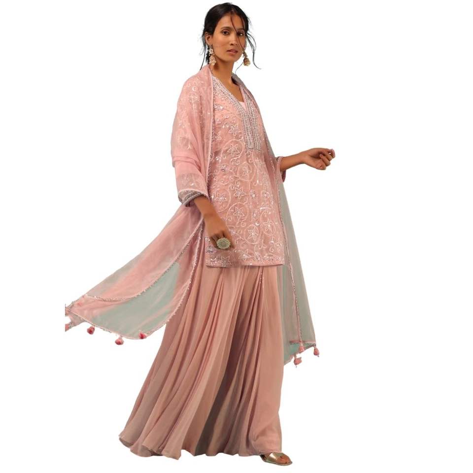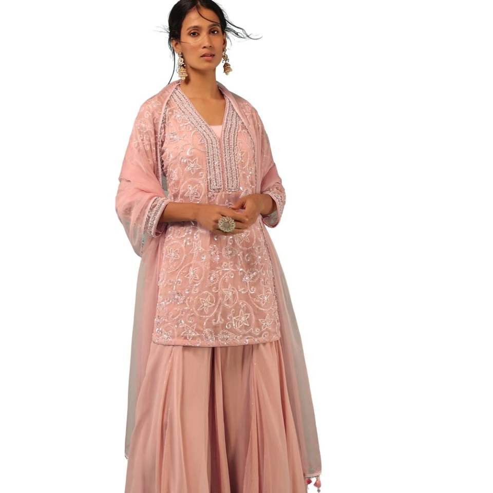 Petal Pink Embroidered Sharara Suit with Cut Dana Jaal Detailing for Elegant Wedding and Festive Party Wear Outfit