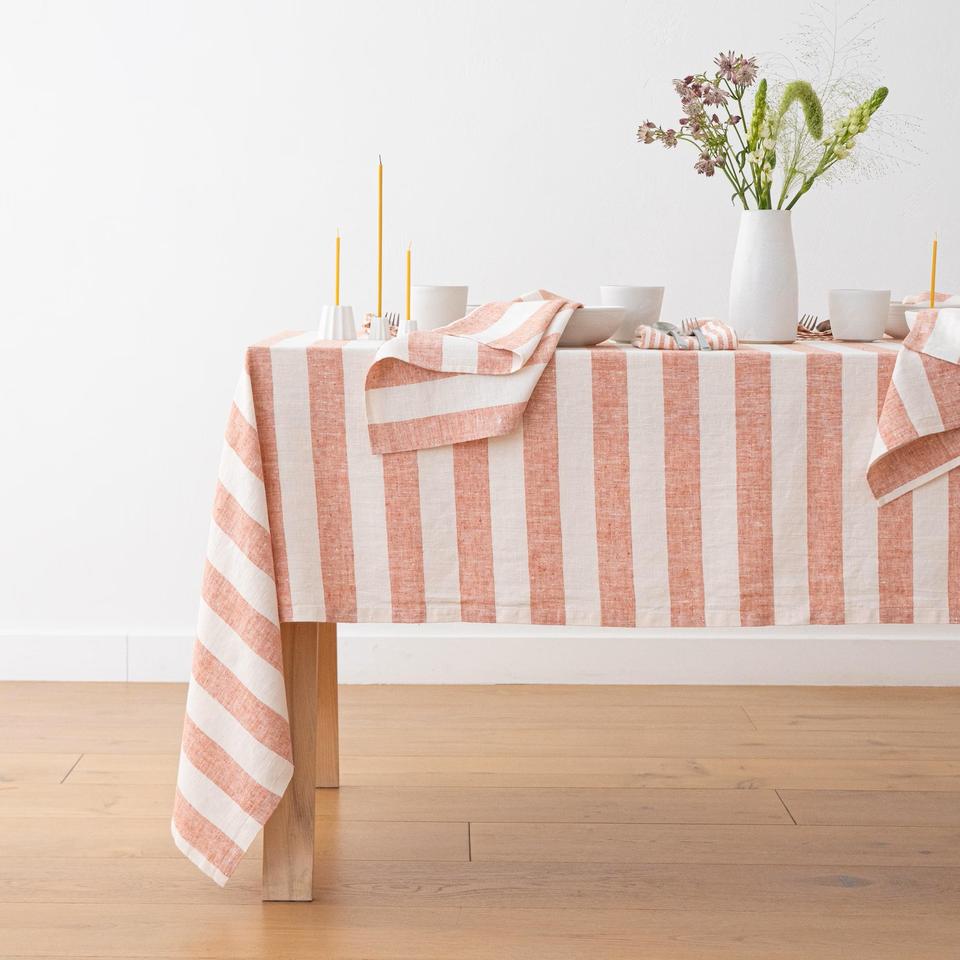 Philippe Handmade Striped Linen Tablecloth in Brick/White Heavy Weight for Round Square or Rectangular Tables