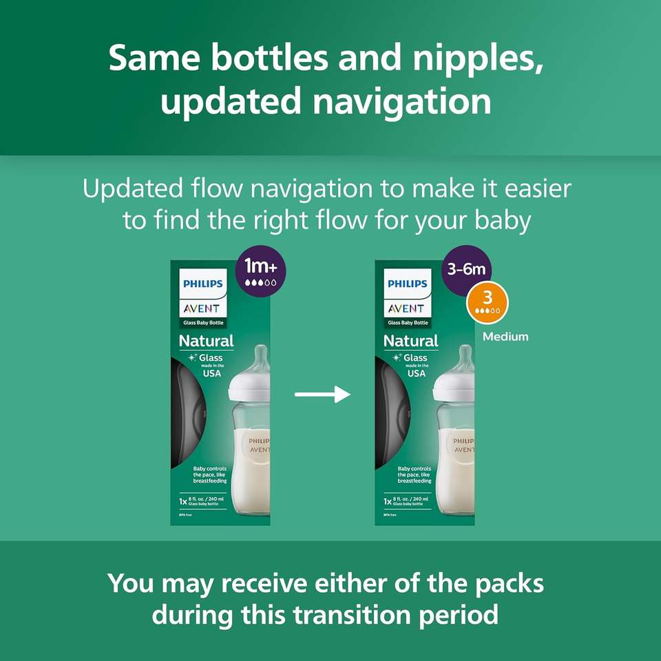 Philips Avent Natural Glass Baby Bottles with Natural Response Nipples (Medium Flow, Flow 3), 8oz, 4-Pack, SCY913/04