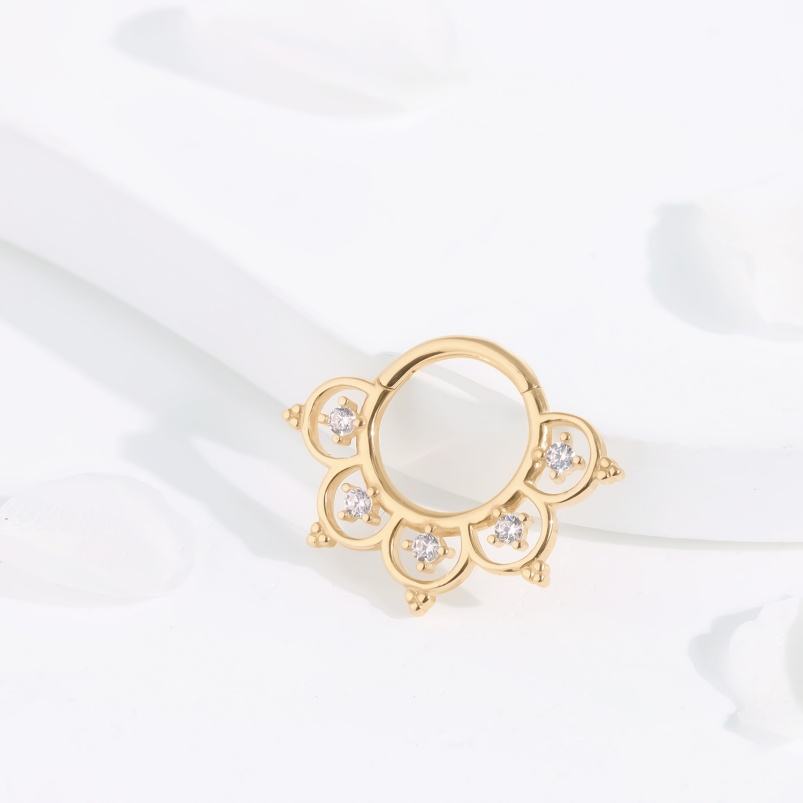 Piercing Stories 14K Solid Gold Flower Shape Nose Ring With 5 Zircon Hinged Segment Ring Cliker Body Piercing Jewelry