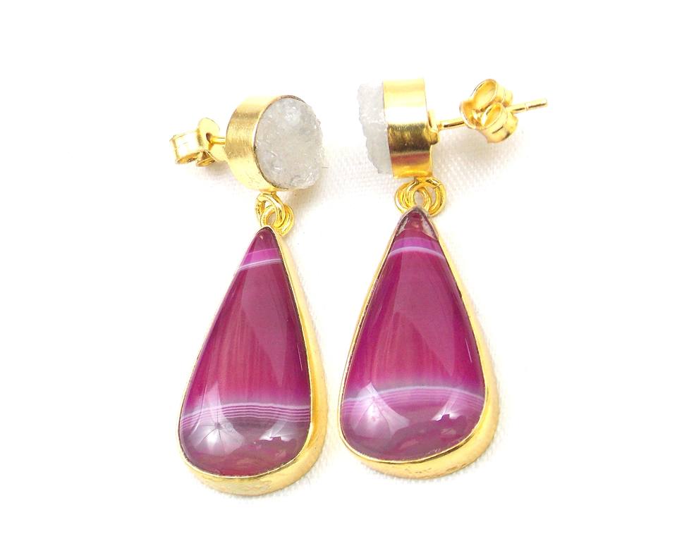 Pink Agate and White Druzy Gemstone With 18K Gold Plated Handmade Pear Shape Fashionable Gift for Her Stud Earrings