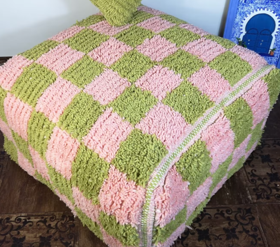 Handmade Genuine Wool Square Pouf Covers Pink and Green Checkered Floor Pillows for Home Decor or Hotel Use Cushion Cases