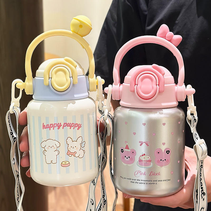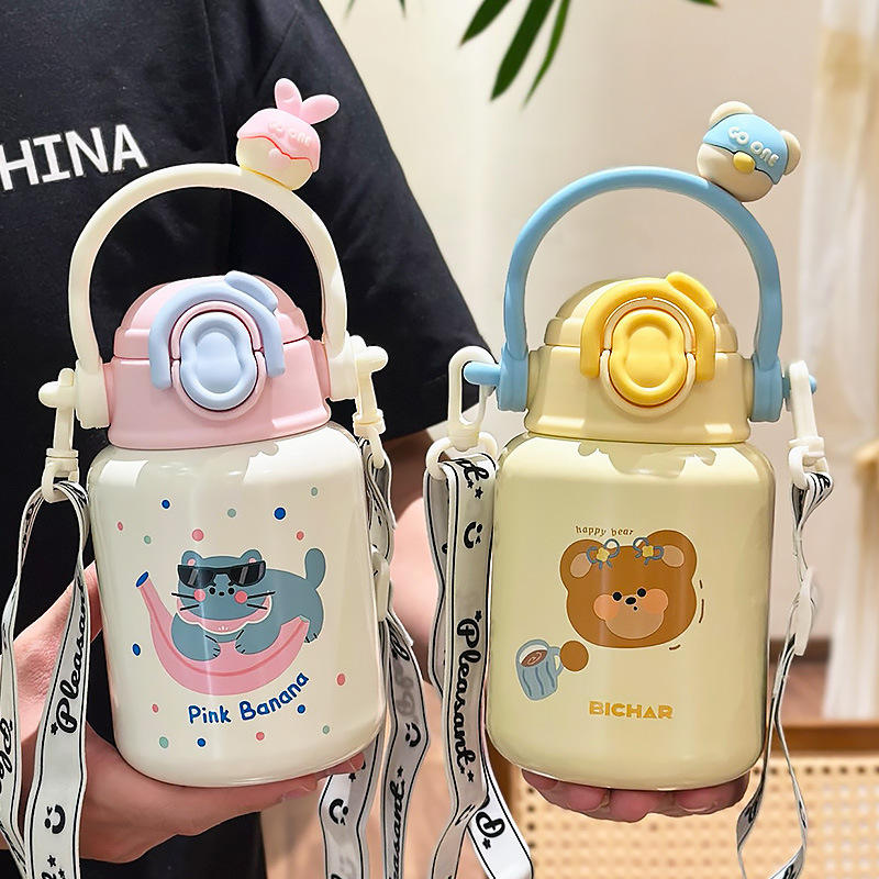 Pink Banana Bichar Kids Thermos Bottle 550Ml Reusable with Strap and Straw for School Use Personal Gift
