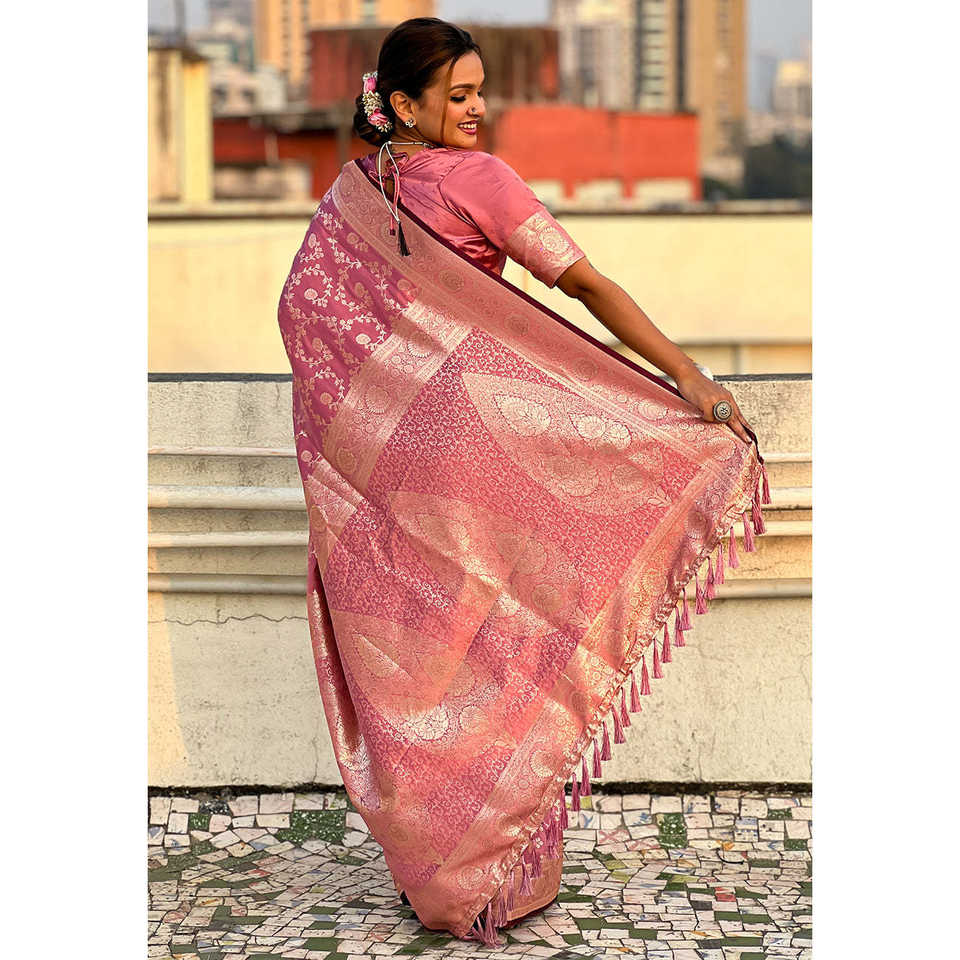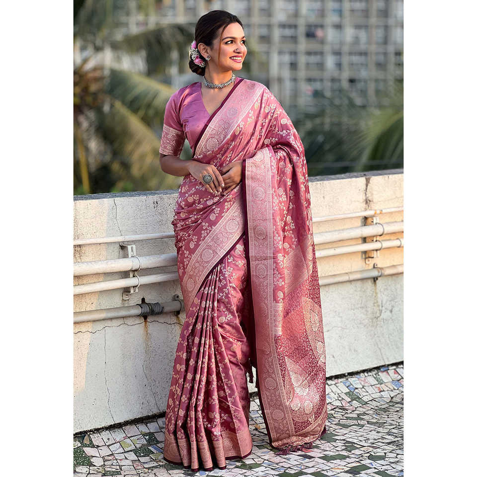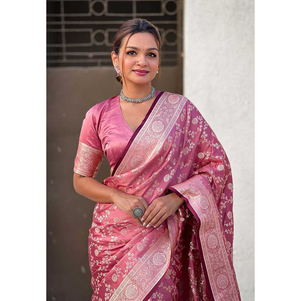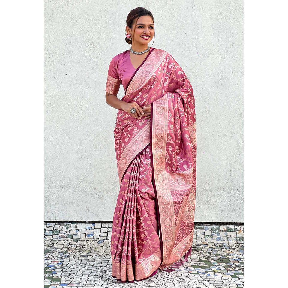 Pink Banarasi Jaal Satin Silk Saree with Pink Zari Woven Indian & Pakistani Clothing