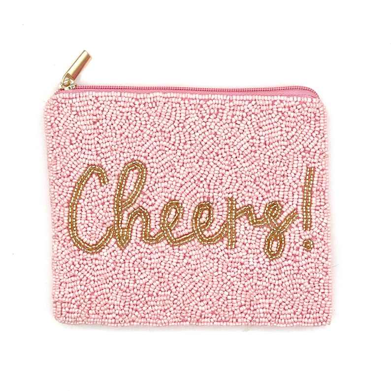 Pink Beaded Coin Purse: "Cheers!" Small Zipper Pouch