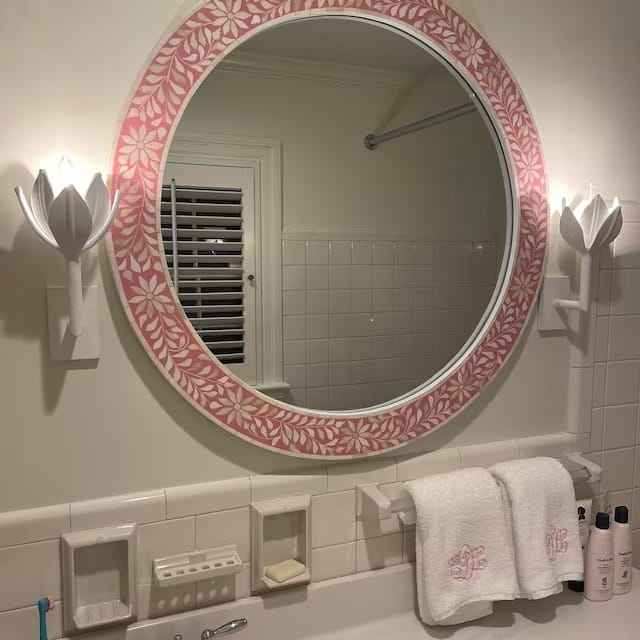 Pink Bone Inlay Wall Mirror This type of mirror is a handcrafted decorative piece often featuring a floral design on the frame