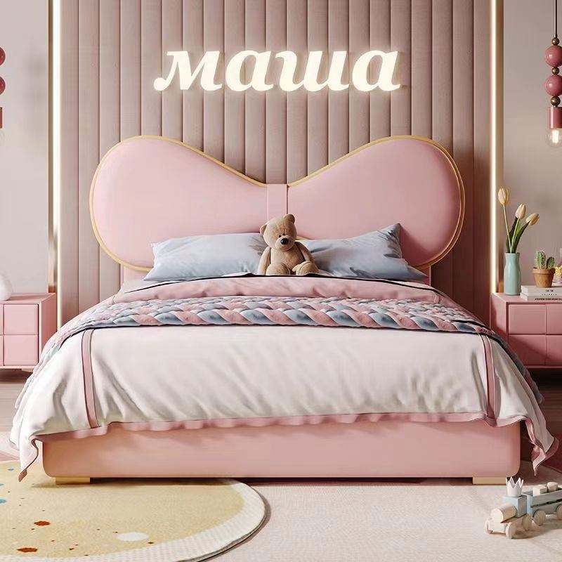 Comfortable Pink Bow Princess Kids Bed Solid Wood Modern Design Full Size for Youth Bedroom Decor