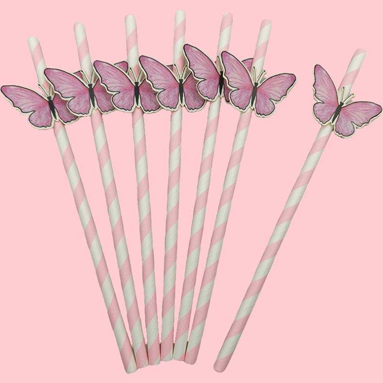 Pink Butterfly Card Disposable Degradable Dessert Table Cake Cocktail Party Decorative Paper Drinking Straw