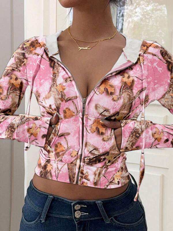 Pink Camouflage Crop Zip Hoodies Women Streetwear Fitted Long Sleeve Top Front Zipper Custom Logo OEM Private Label Wholesale